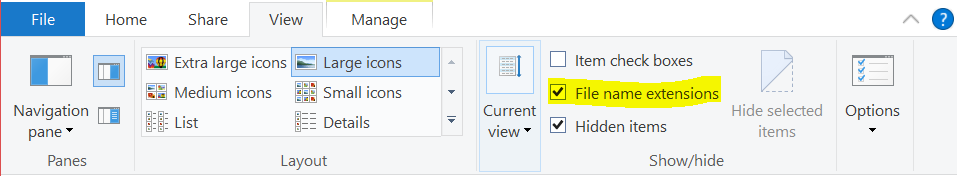 Windows hides these helpful indicators by default. You can fix this in the View tab of Windows File Explorer (highlighted). If you don’t see the following try a quick google search for “show file extensions” for your version of Windows. It’s pretty easy to change.