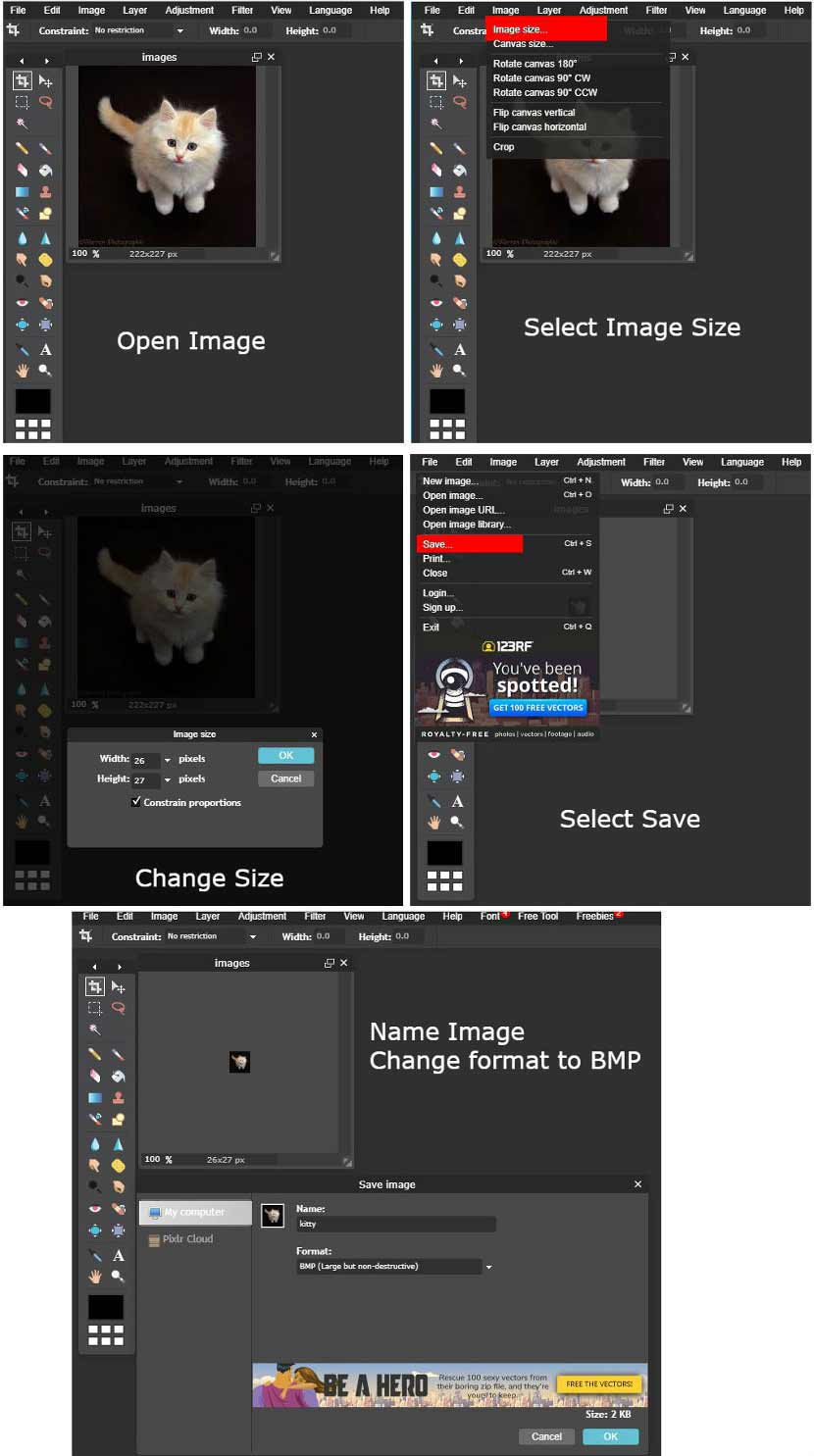 Pixlr.com is a free online bitmap editor that you can use through your browser, no need to download or install anything. Pixlr will let you choose an image from a file or a URL to upload into their image editor. From there you can resize the image, then save it as a bitmap.