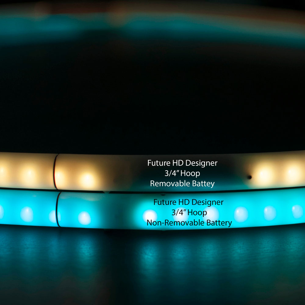 Depending on the mode you’re in, an internal battery FutureHoop can last 2-5 hours before it would need to be plugged in to charge. FutureHoops charge via micro USB cord and come with a USB wall charger.