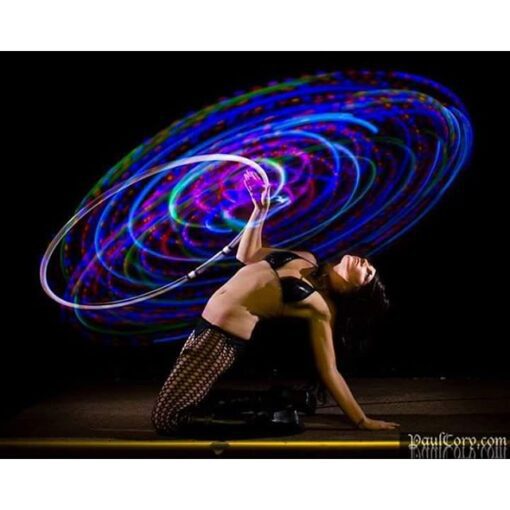 Tona “Moonkitty” Willet is captured in a strong back bending pose with light trails of blues and purples spiraling above her. Paul Cory Photography has mixed the technique of capture long exposed LED hoop lights and blended it with a fashionable performer to catch this classic LED hoop in a stylish way.