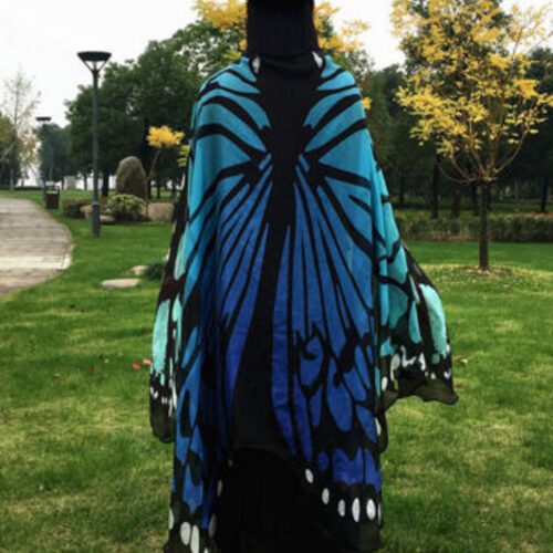 When looking at the butterfly print close up the pattern will appear more pixelated. From even a short distance the pixelation is no longer noticeable and the eyes focus on the stunning pattern as a whole.The butterfly bustle has a 76 inch wingspan, and is 50 inches at its longest point. Each tie strap is 15 inches in length.
