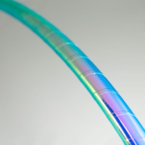 The Blue Iridium hoop's iridescence changes drastically depending on the lighting and angle. Metallic colors morph from magenta highlights into deep violets, purple, indigo, teal, and turquoise, creating a captivating liquid effect of all the dreamiest mermaid colors.