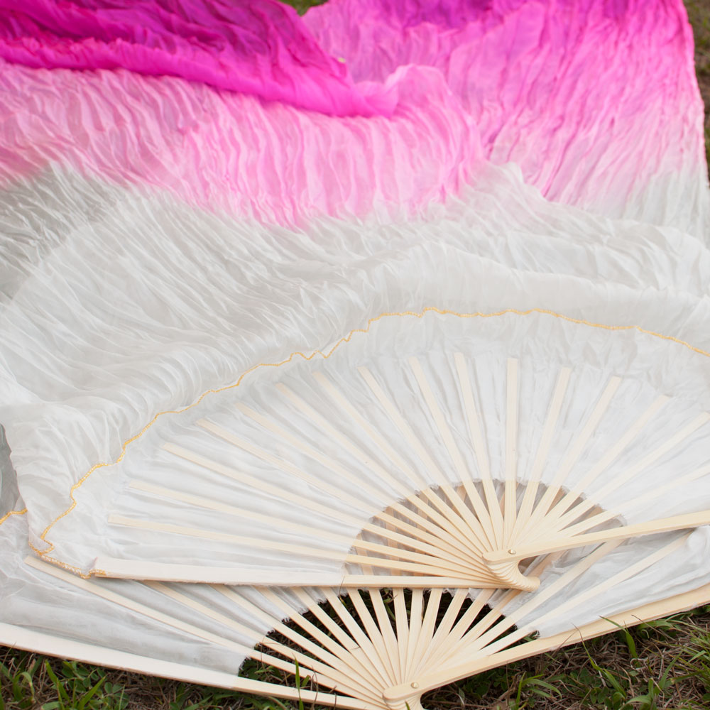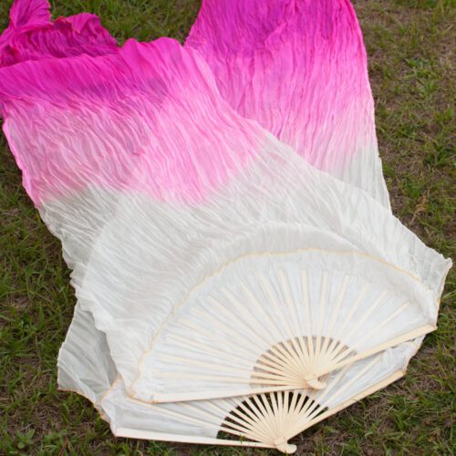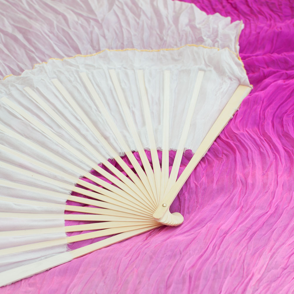 Each silk fan is hand-dyed which may create slight fluctuations or spots in the color that are unique to the individual fan. The wood used for the fan frame may also have slight fluctuations in the color, which is a natural part of the material.