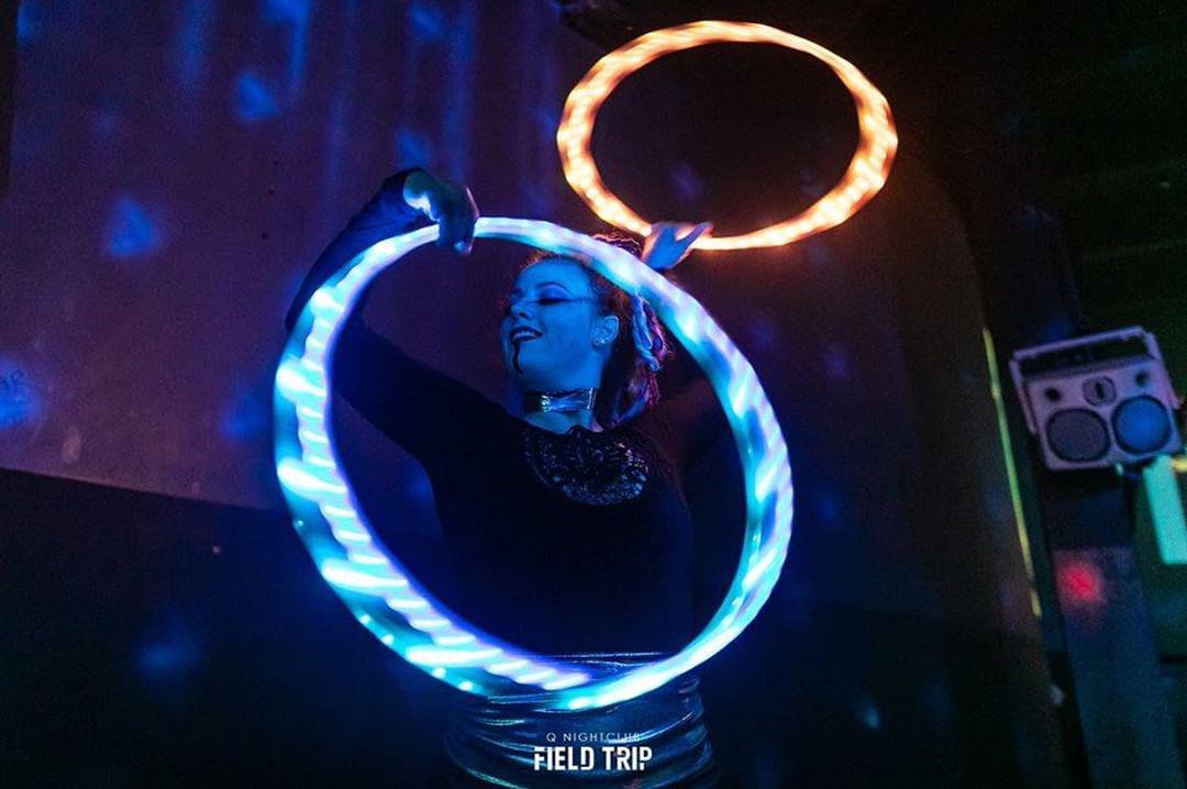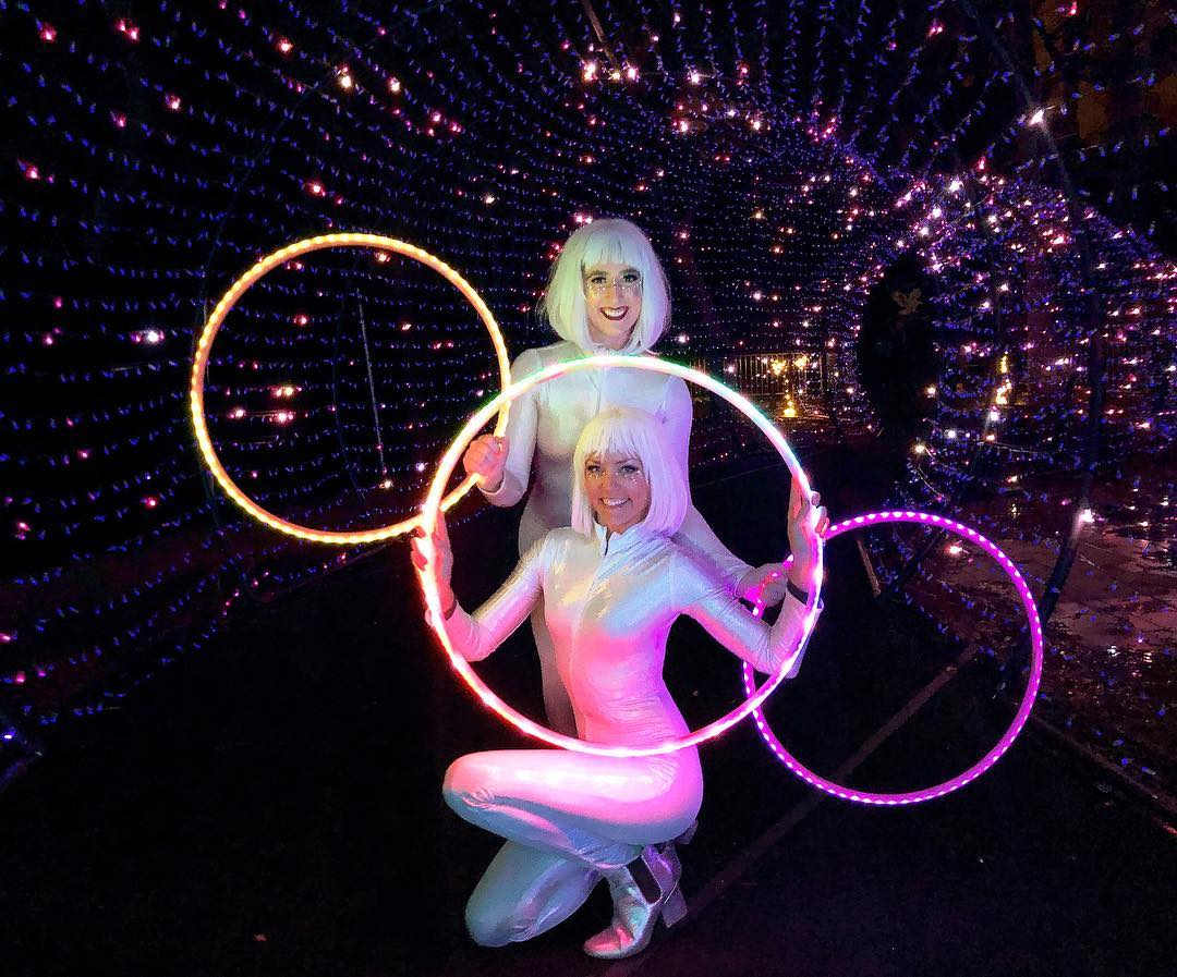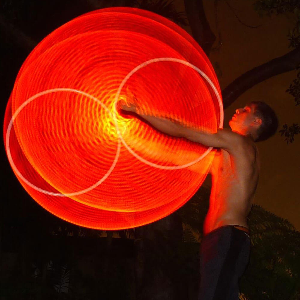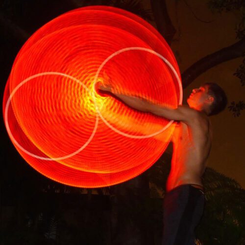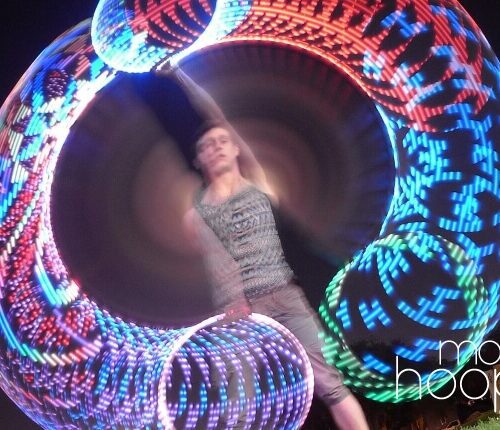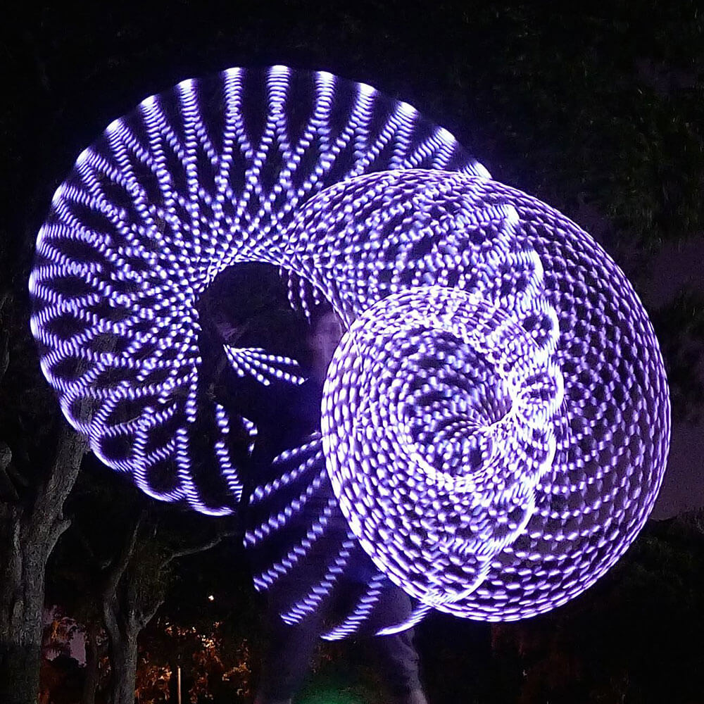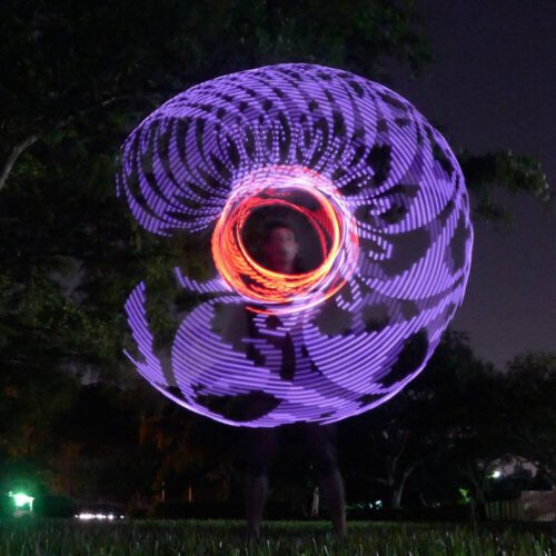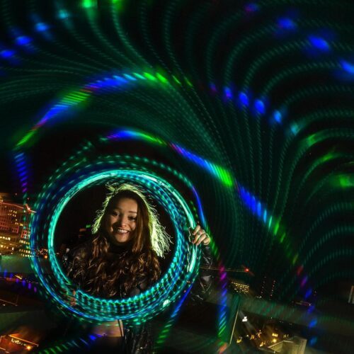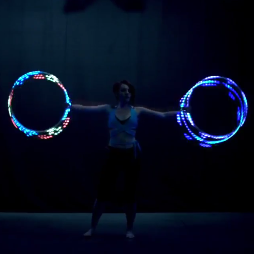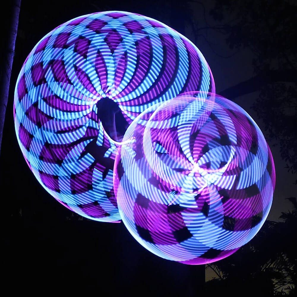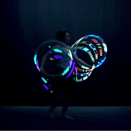 Sync up your FutureHoop patterns and changes with other FutureHoops to create a choreographed performance lightscape with other performers! We’ve thoughtfully designed the hoop to be geared towards performers so the hoop makes changes seamlessly as you cue the customized patterns or when you press the Next button.