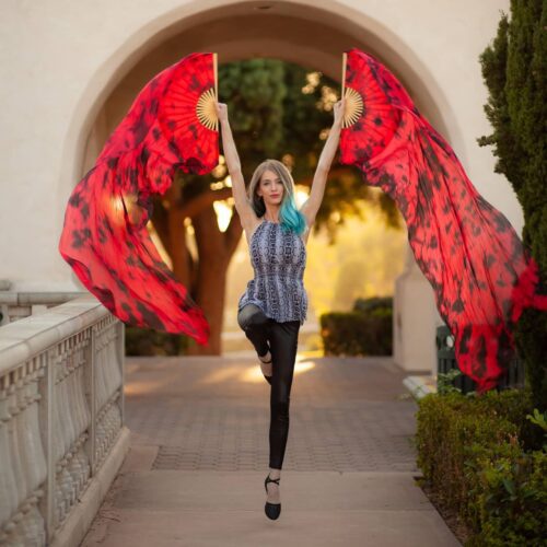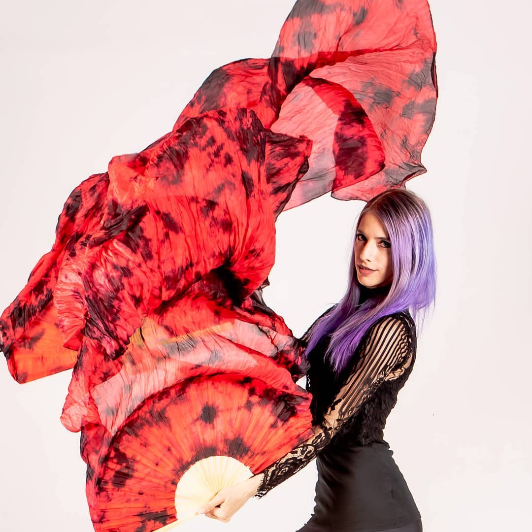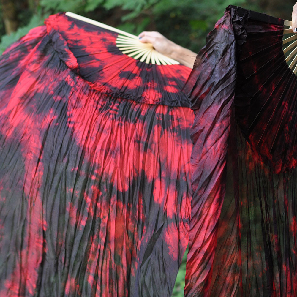 Each silk fan is hand-dyed which may create slight fluctuations or spots in the color that are unique to the individual fan. The wood used for the fan frame may also have slight fluctuations in the color, which is a natural part of the material.