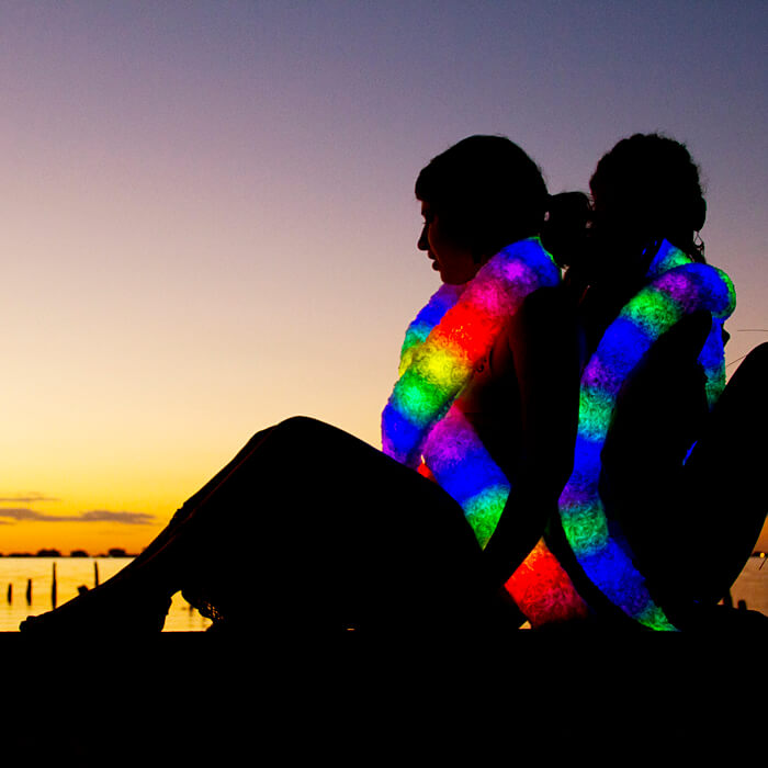 Part cozy accessory, part wearable light experience, the PixelBoa blends soft faux fur comfort with expressive animated color.