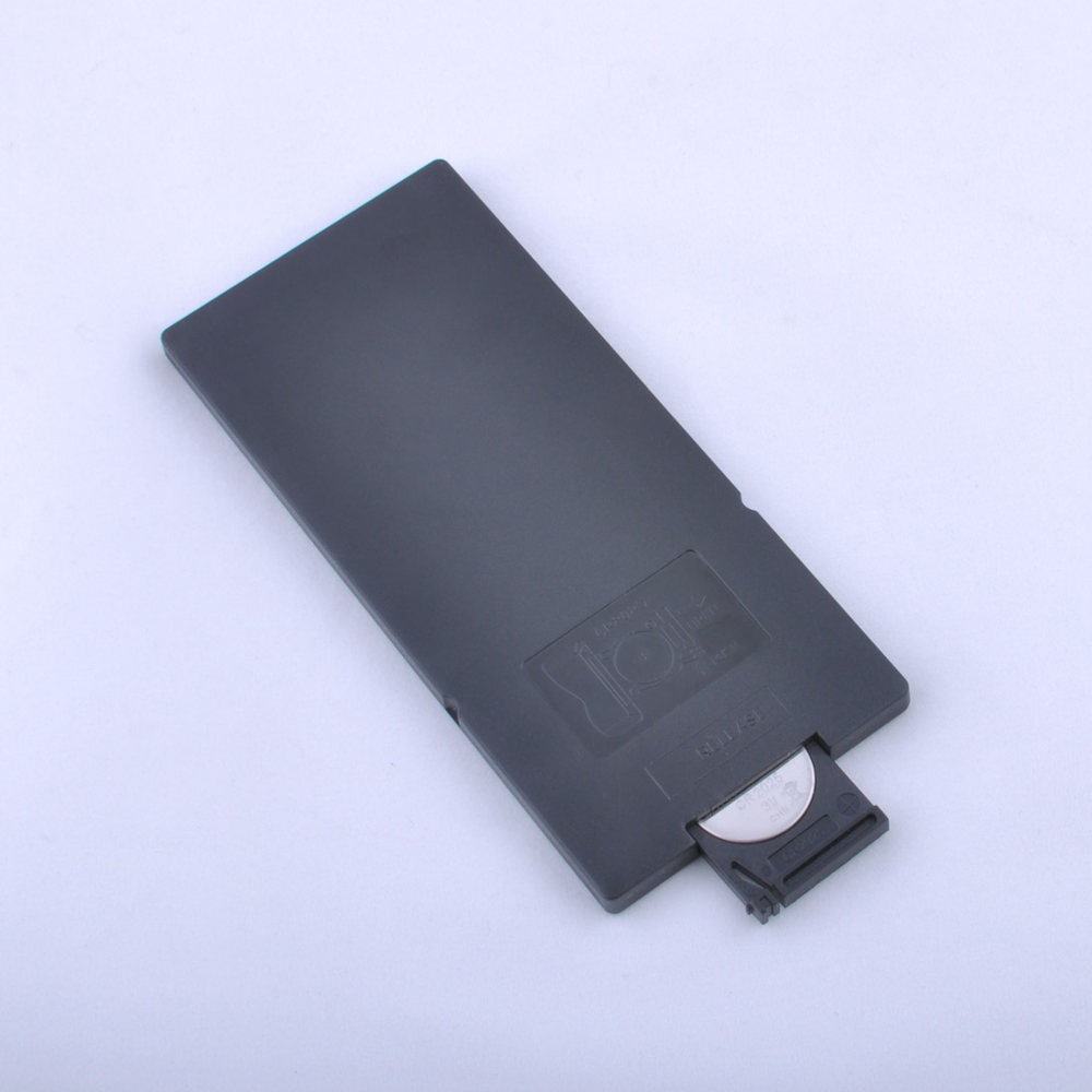 To open up the compartment where the battery is, you’ll want to squeeze the little black tab on the back bottom left of the remote in towards the larger black tab next to it. Squeeze the little tab in and pull the compartment out with your finger or nail, and it should slide out. Replace the battery with the ringed side facing down, then slide the tray back in so it clicks into place.