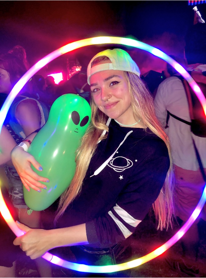 SpaceBabeTay hoops with a 30 in. FutureHoop Designer (removable batteries, HD LEDs) in 5/8 clear polypro.
