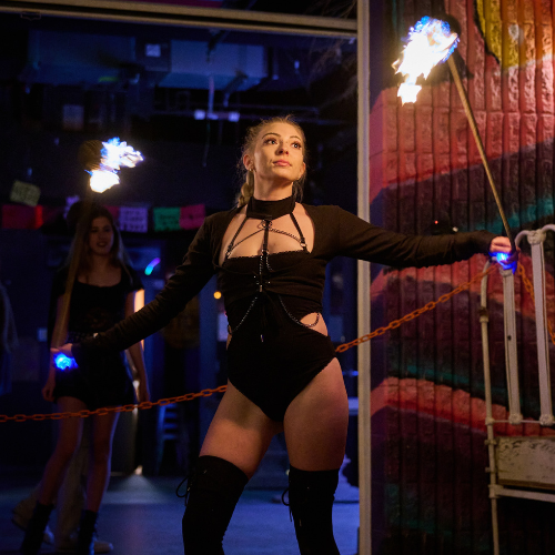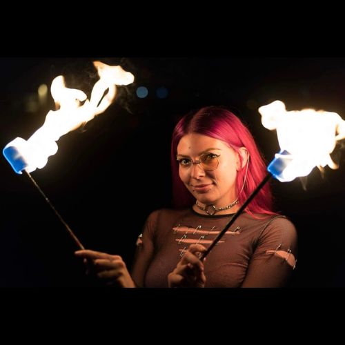 Allie's main props are hoops, fans, and poi. She dabbles in juggling, double staves, fire eating and breathing, and aerial arts.