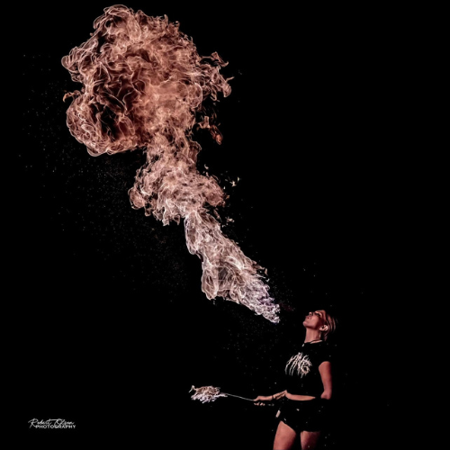 If you're local to Denver, find her spinning fire at the Monday night flow jams at the Denver Circus Collective!