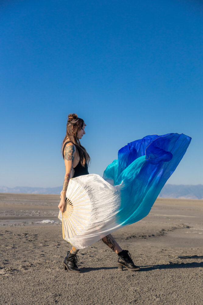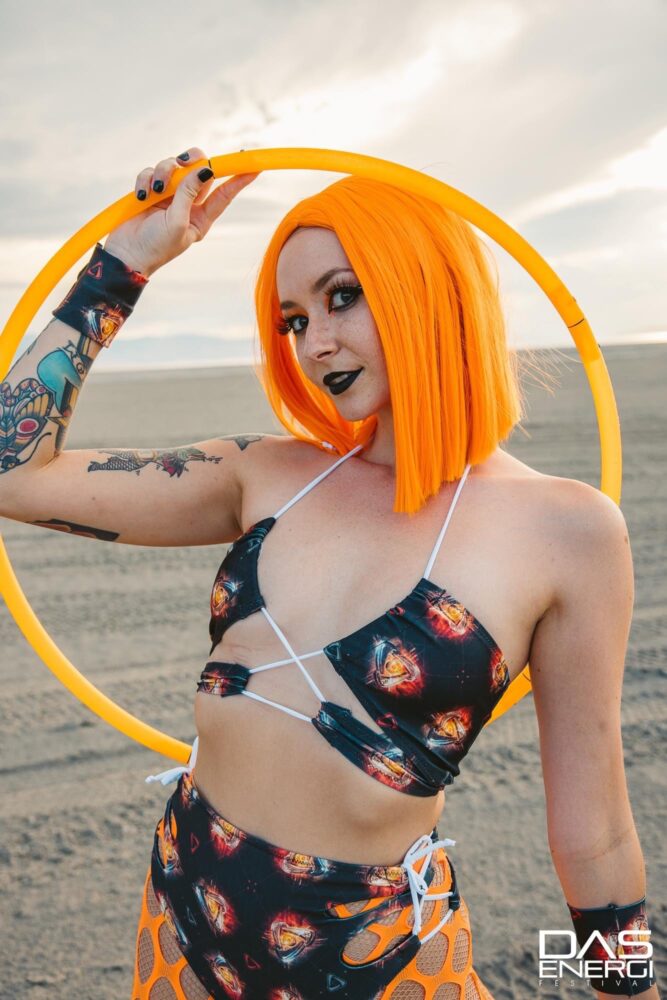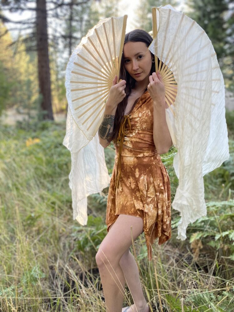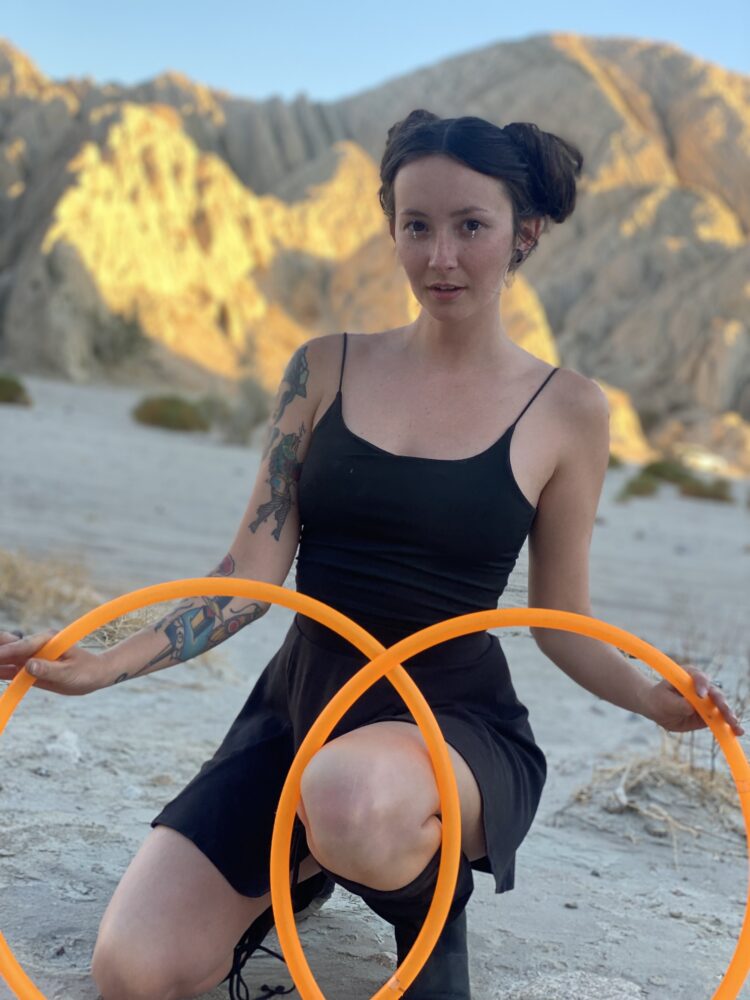 Shauna Nikles is a flow artist from Ohio, who now travels full time throughout the western United States. Flow started as just a physical emotional release from a boring small town life to opening up a whole world of wonder, community and friendship. She began hooping in the winter of 2015 into 2016 and stayed as a single prop artist til picking up silk fans in 2022. Shauna has always been called to performance art, taking the stage in both high school and college singing and dancing. Flow arts has always felt like an evolution of that part of her existence.