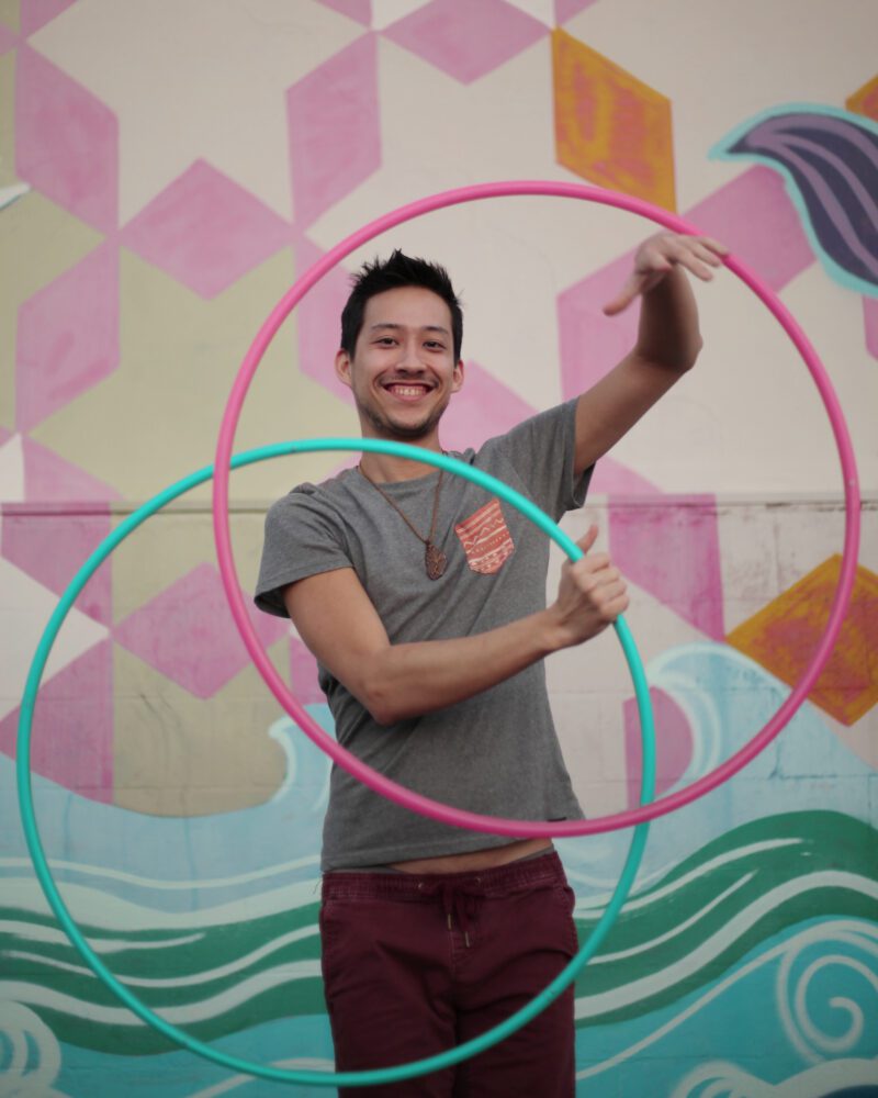 I discovered hooping while studying music at Florida State University in 2015. Two of my close friends hooped, and I always found myself mesmerized by it. Before I started hooping, I would even have flute/hoop dates with my best friend – we called it Flooping – don’t laugh! Eventually they taught me an isolation, an escalator, a vortex… and I was hooked. I had to stay in school an extra year while all my friends graduated and moved away – the hoop became my best friend. I actually found my flow out of a very dark depression, and the flow arts community truly healed me.