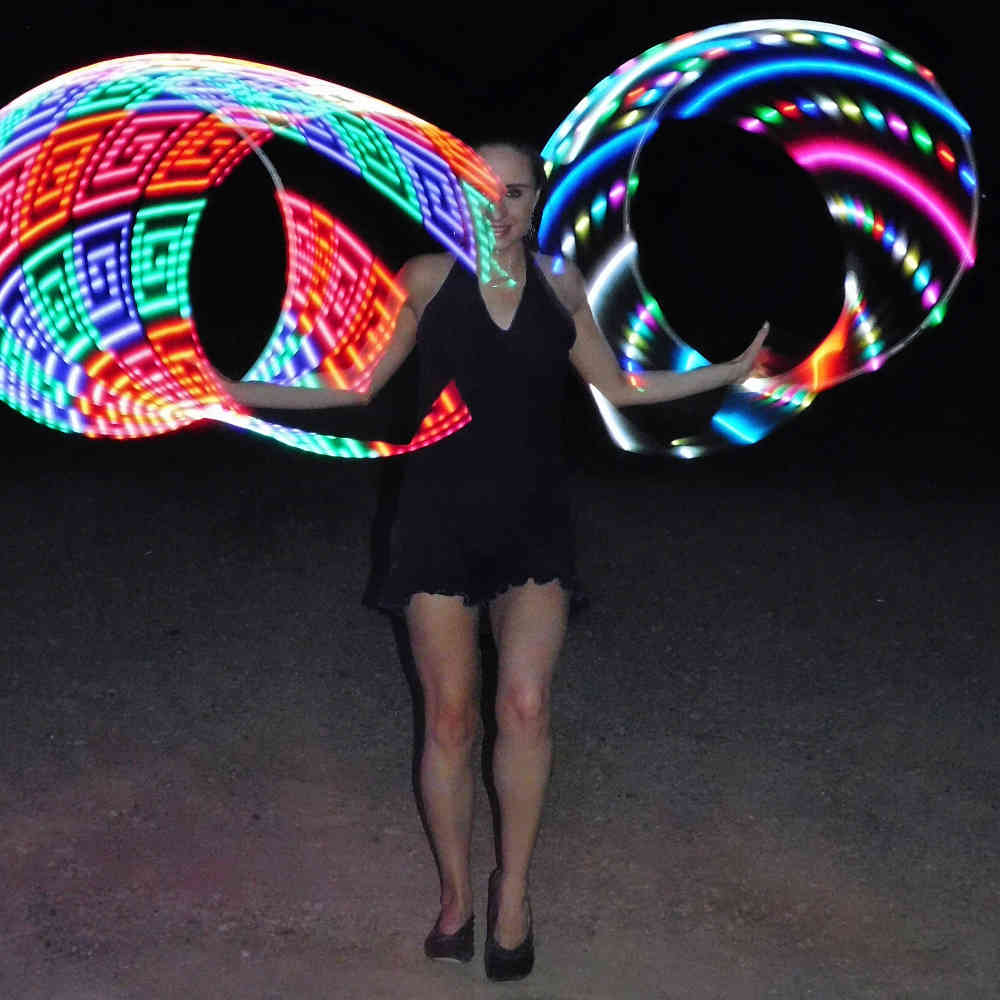 I began hooping in April of 2012 at age 25. I was inspired by a good friend carrying around a kid’s hula hoop and being unsure why. One of her friends was a hoop dancer and she introduced me. I was immediately interested in hula hooping with her, but never knew how to. So after many failed attempts, I googled how to hula hoop and I was presented with a large list of videos showing hooping, tricks, and hoop dancing. It was love at first sight! I decided I was going to do it! The first video of hoop dance I ever saw was Shakti Sunfire’s Boulder Dance Video