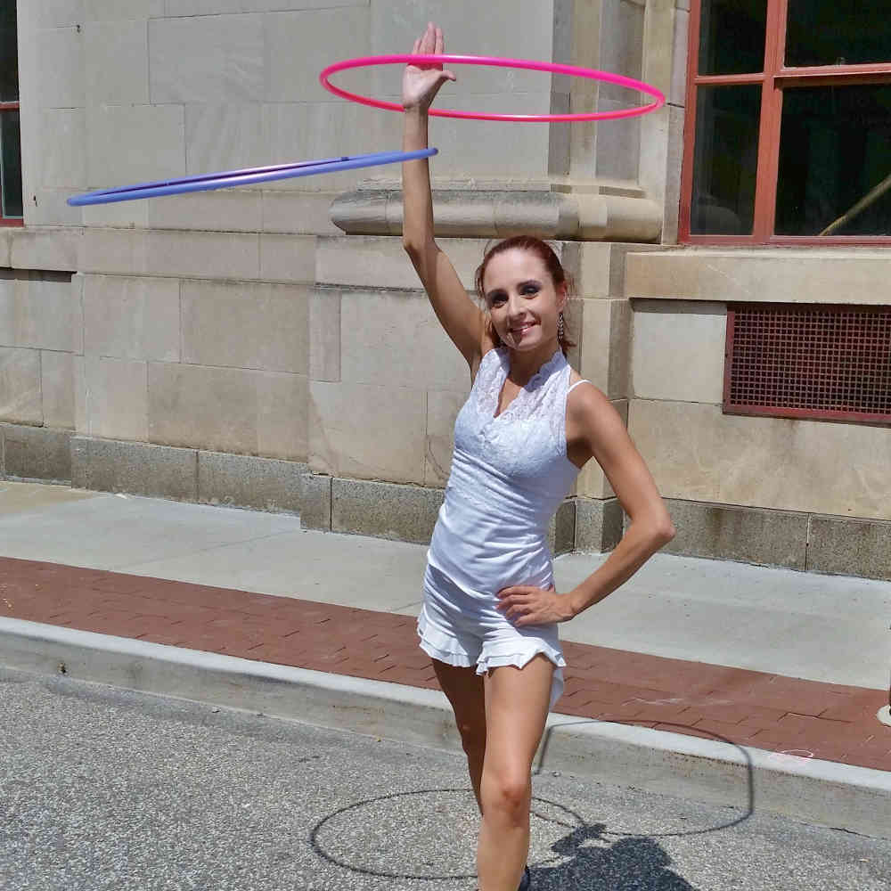 I like to think I am a perfect mix of tricks, flow, and dancing. I like to balance tricks with dance as much as possible. I like to keep my speed slow to medium. I rarely hoop fast and prefer to have a fluid, clean line set of techniques. I highly respect fast hoopers because of the energy and focus it takes, but it isn’t my style. I emphasize clean transitions as well. I am especially inspired by Morgan Jenkins, Taylor Duffrin, Marika Cockney, and Amanda Lee.